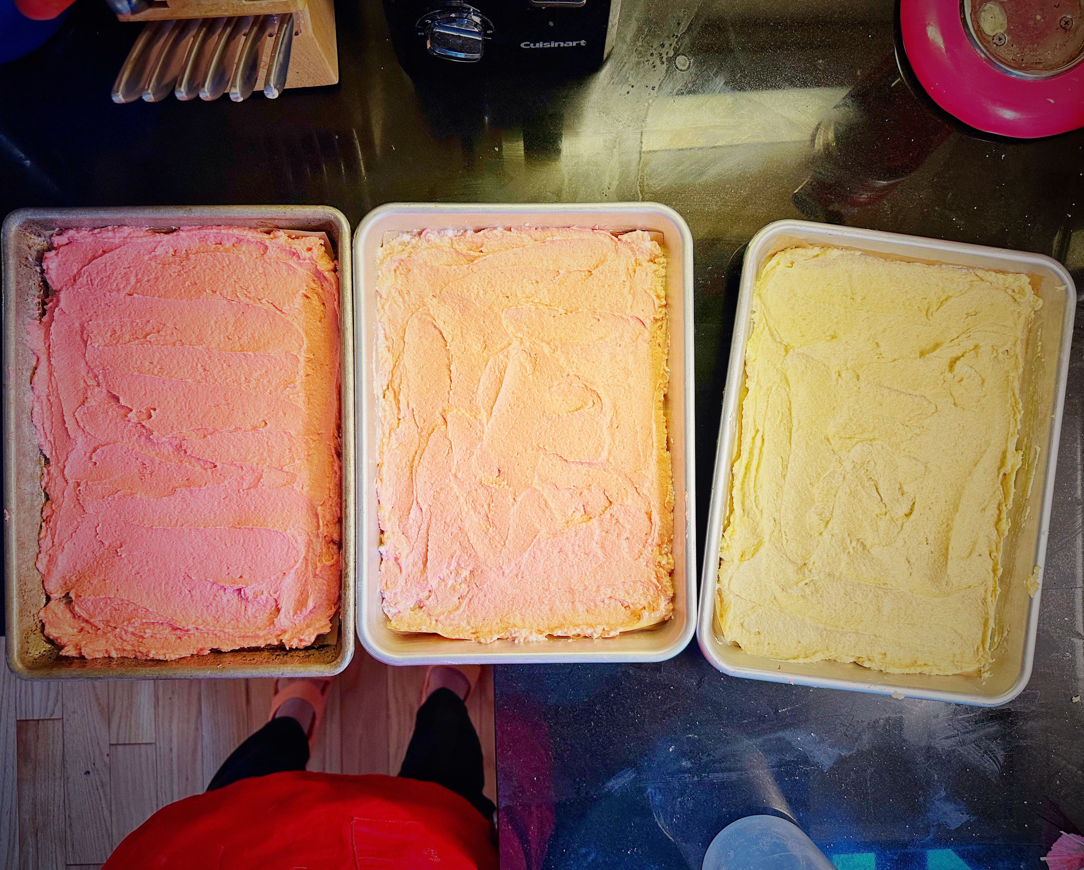 - Spread the separate batters into each of the prepared pans with an offset spatula, evenly, all the way to the edges of the pan.
