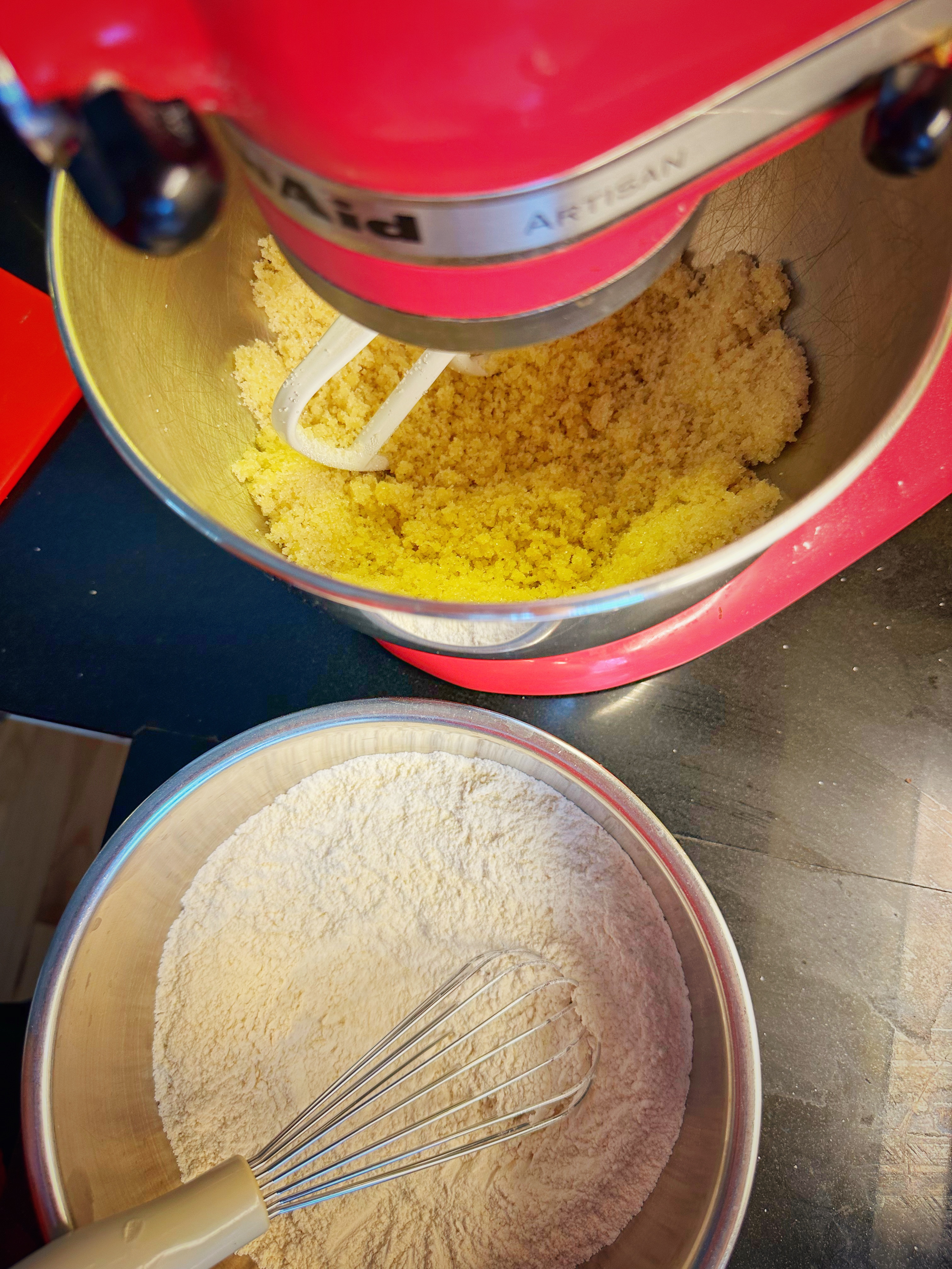 - Add butter to the flour and sugar mixture and beat on medium speed until light and fluffy. Stop and scrape down the sides of the bowl a couple times during this process to make sure it is evenly mixed.