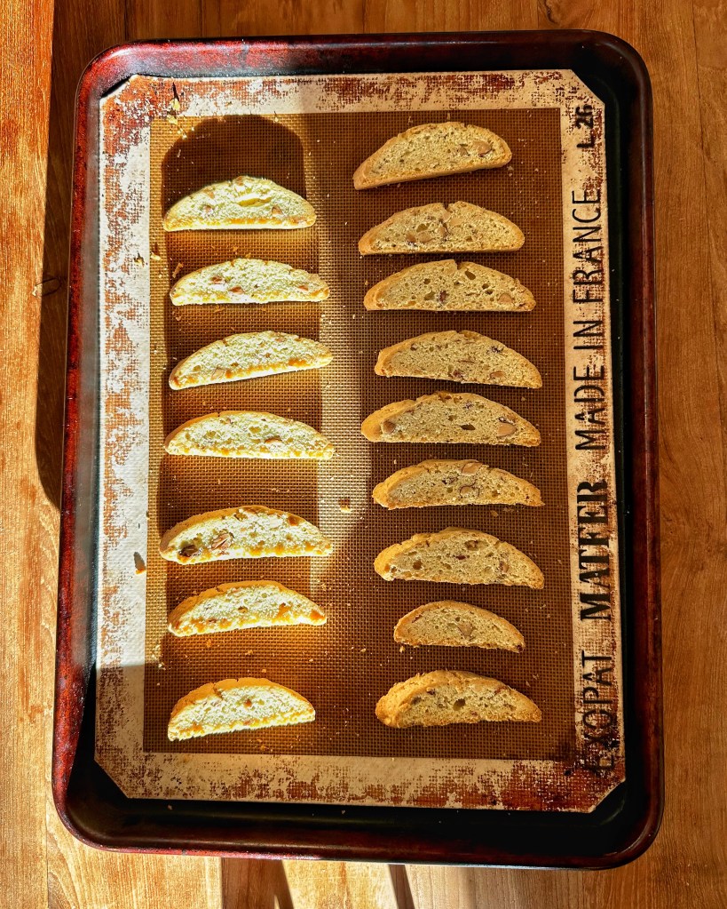 - I didn’t have grappa, so I used amaretto, because amaretto is becoming a thing for me now, and the flavor complements the almonds in the biscotti. I also reduced the amount to 1T (from 1T + 1t). I found the original recipe for the dough to be slightly sticky, so reducing the liquid (the liqueur and the extract) helped with that.