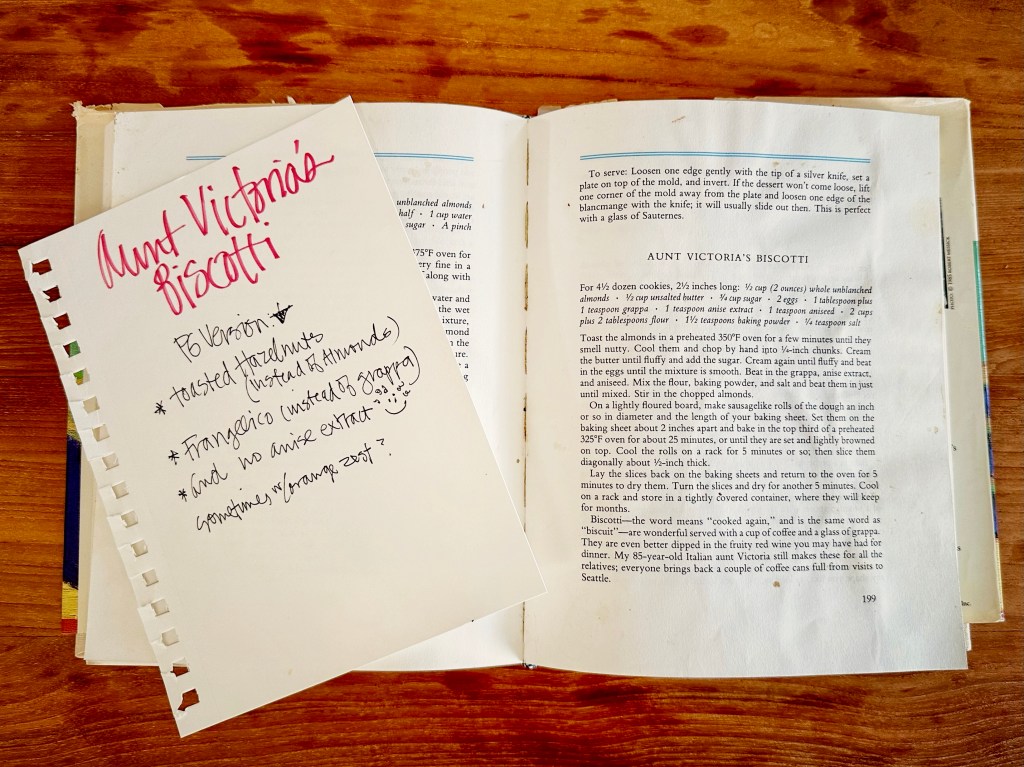 The recipe in the book that contains the closest thing to a personal anecdote is Aunt Victoria’s Biscotti. Shere grants us but one sentence: “My 85-year old Italian aunt Victoria still makes these for all the realtives; everyone brings back a couple of coffee cans full from visits to Seattle.” All I have to say, is “more of this, Lindsey!!”