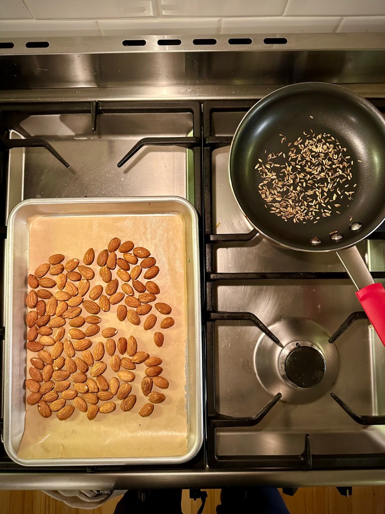 - Toast the almonds in a pre-heated 350F oven until they smell nutty (about 10min). Turn oven down to 325F.