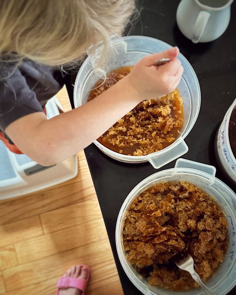 Granita is easy to make, and a great activity to do with the tiny humans, because you can’t really mess it up. Simply dissolve sugar in hot coffee (ok, a grown-up should do that part), put it in the freezer, then take it out periodically and scrape with a fork to create ice crystals (this is the part kids love).