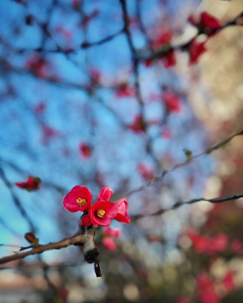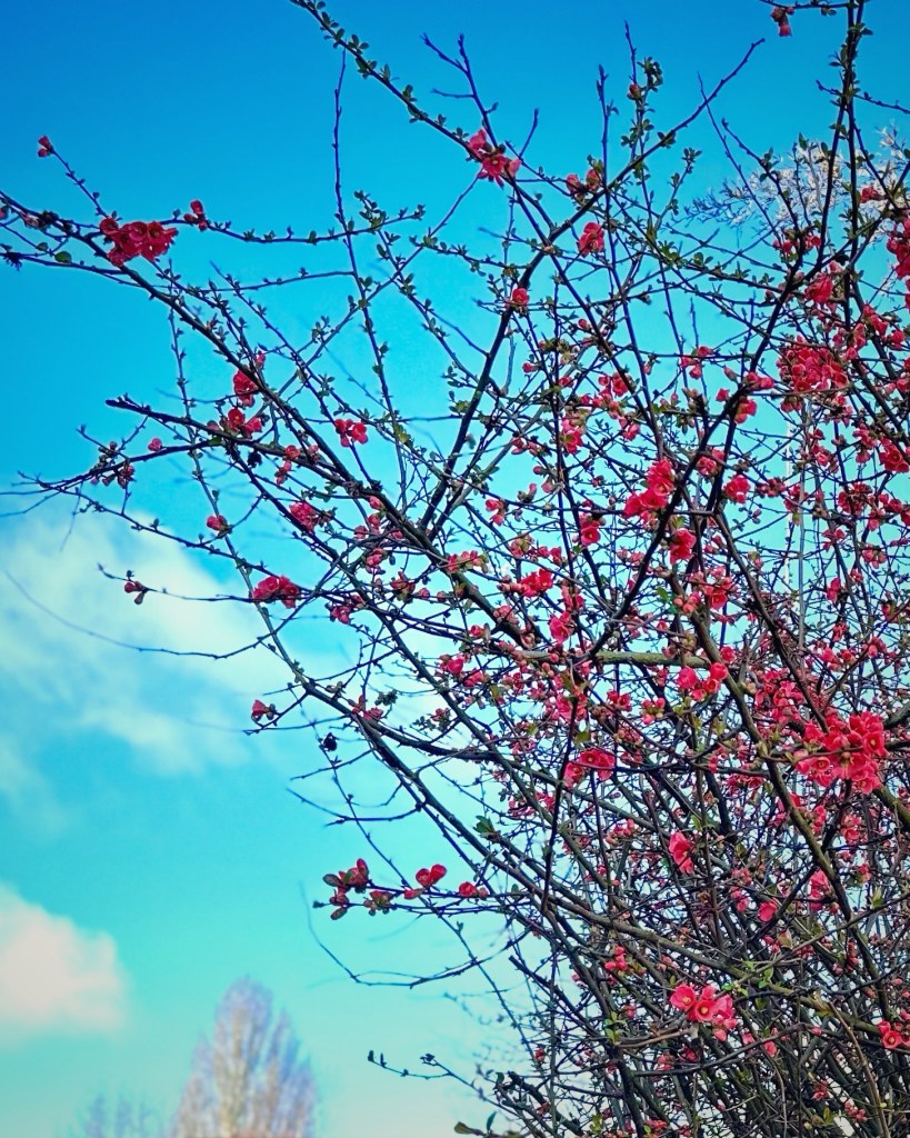 There may still be a nip in the air, but the view from my kitchen window is a harbinger. Our flowering quince tree is in full bloom 🌸