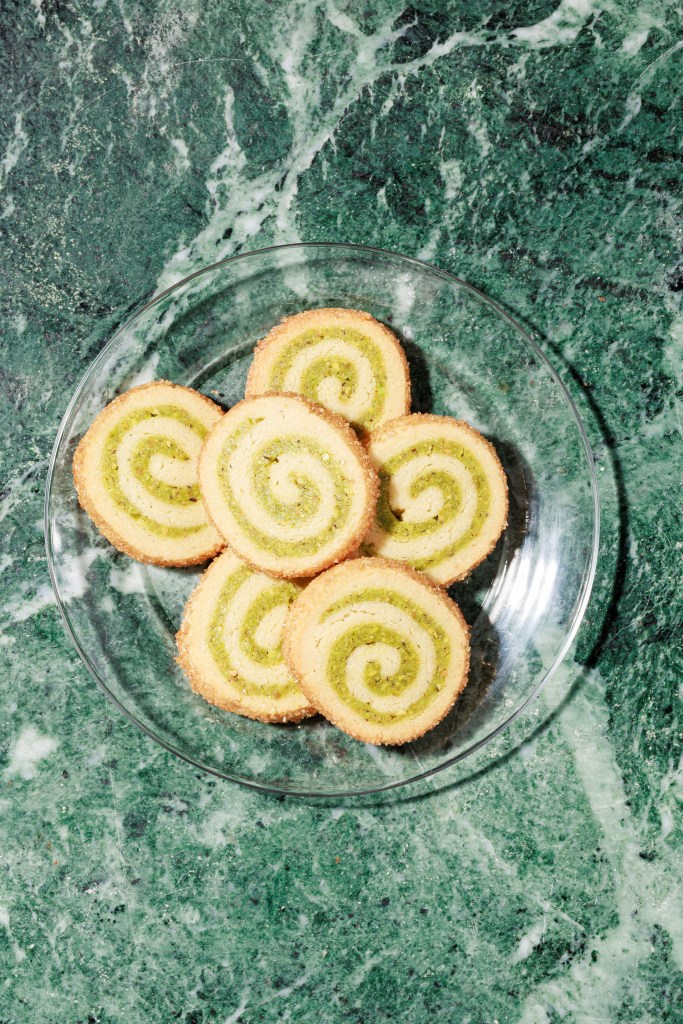 These aren’t just any slice-and-bake shortbread. Two different doughs, flavored separately with ground almonds and pistachios, get rolled up tight into what look like little cookie sleeping bags. The ground nuts in the dough make for an unexpectedly tender cookie with maximum nutty flavor. When sliced, that grinchy green swirl gets revealed, in all its glory.