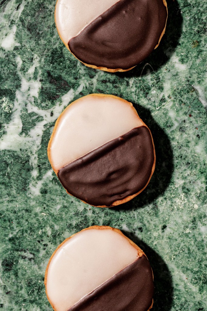 The base cookie is soft, cakey, and scented ever so slightly with lemon zest. It’s topped with a firm glaze that took me a while to formulate just right. FYI, if you’re making these at home, many glaze recipes are far too runny and won’t yield that crisp, clean line down the center of the cookie. You want to create something that’s actually solid at room temp and requires some warming to work with. A challenge I became a bit obsessed with. But, I’d like to think I mastered it. And now when I glaze these cookies I kind of go into a zen state making them just right.